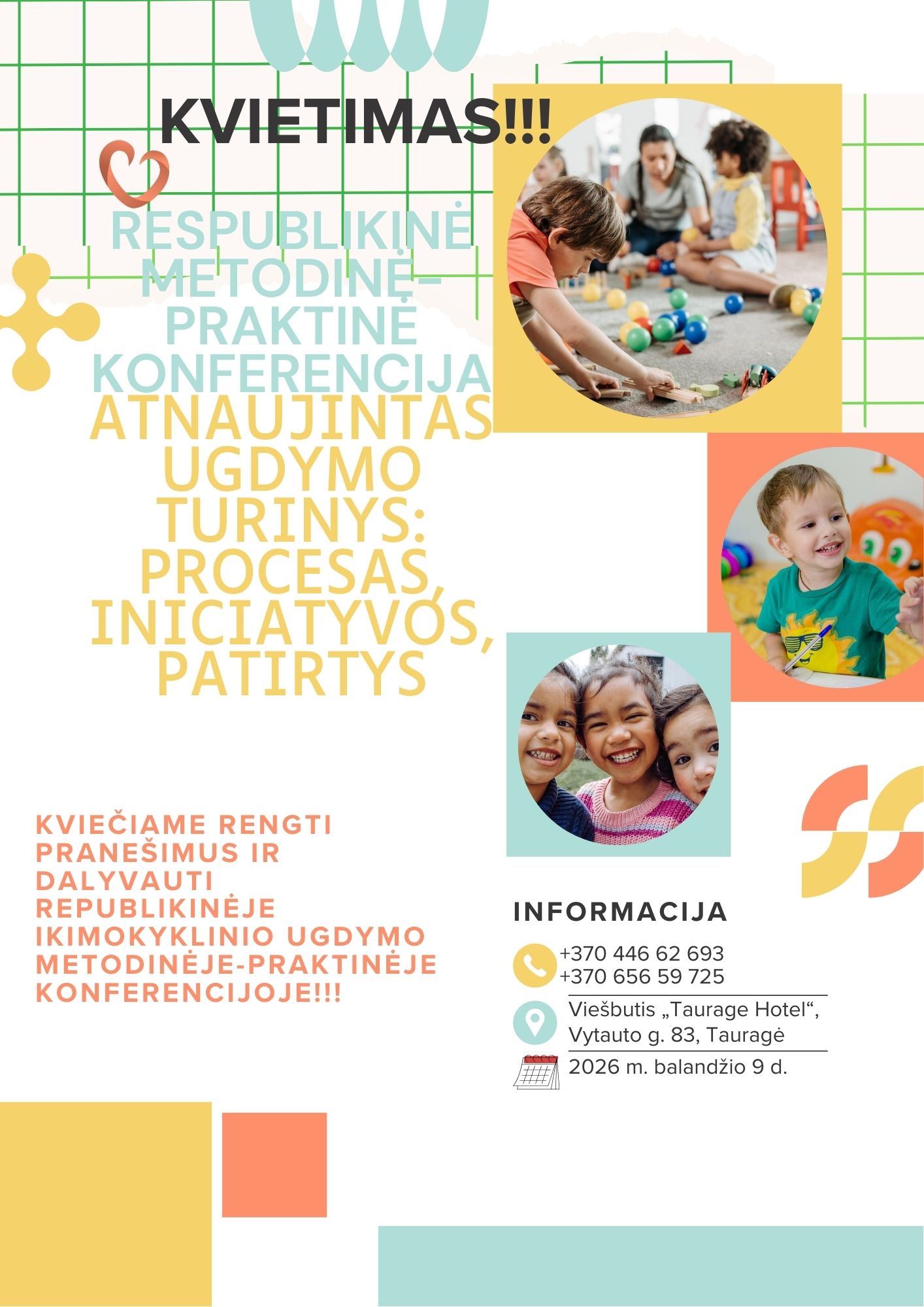 2026-04-09 organizuojama respublikinė ikimokyklinio ugdymo įstaigų konferencija „Atnaujintas ugdymo turinys: procesas, iniciatyvos, patirtys“. Konferencijos probleminės sritys: – Realūs ir virtualūs ugdymosi kontekstai patirtinėje žaismėje; – STEAM ugdymo idėjų įgyvendinimas ikimokykliniame amžiuje; – Gamtamokslinio – ekologinio ugdymo(si) kontekstai ir patirtys; – Patirtinis mokymas(is) vaikų darželyje. Respublikinės konferencijos „Atnaujintas ugdymo turinys: procesas, iniciatyvos ir patirtys“ NUOSTATAI