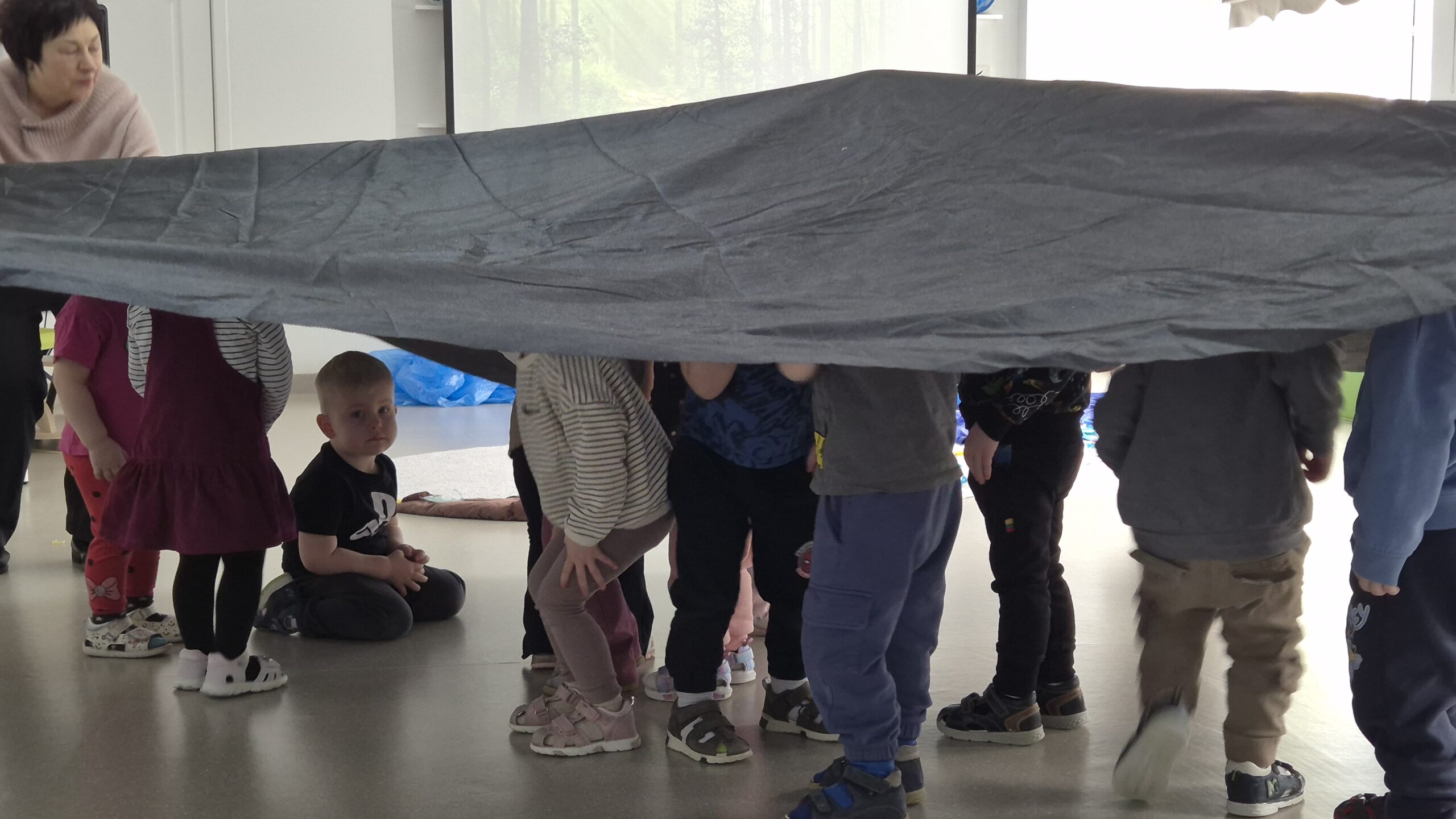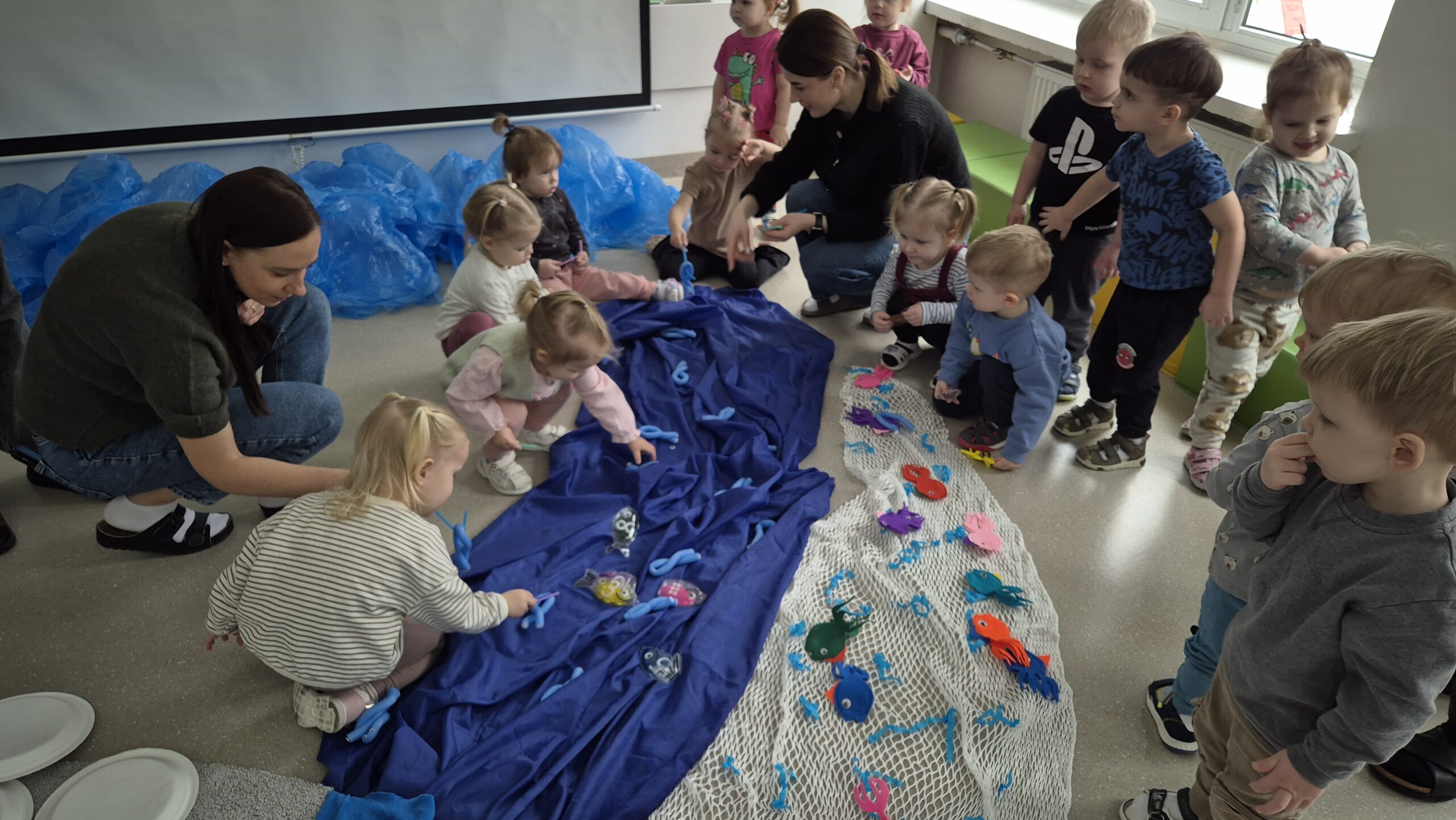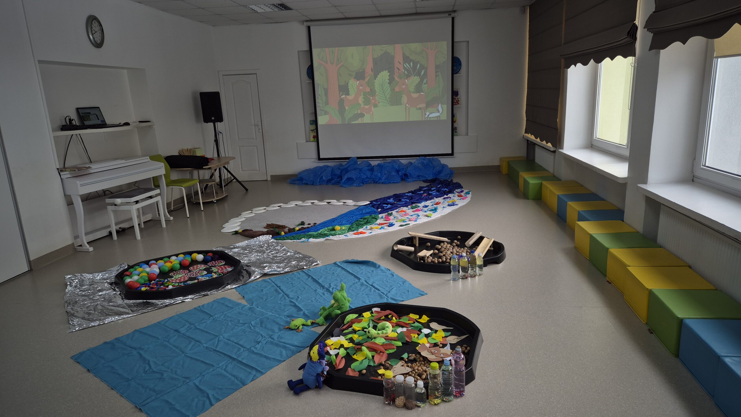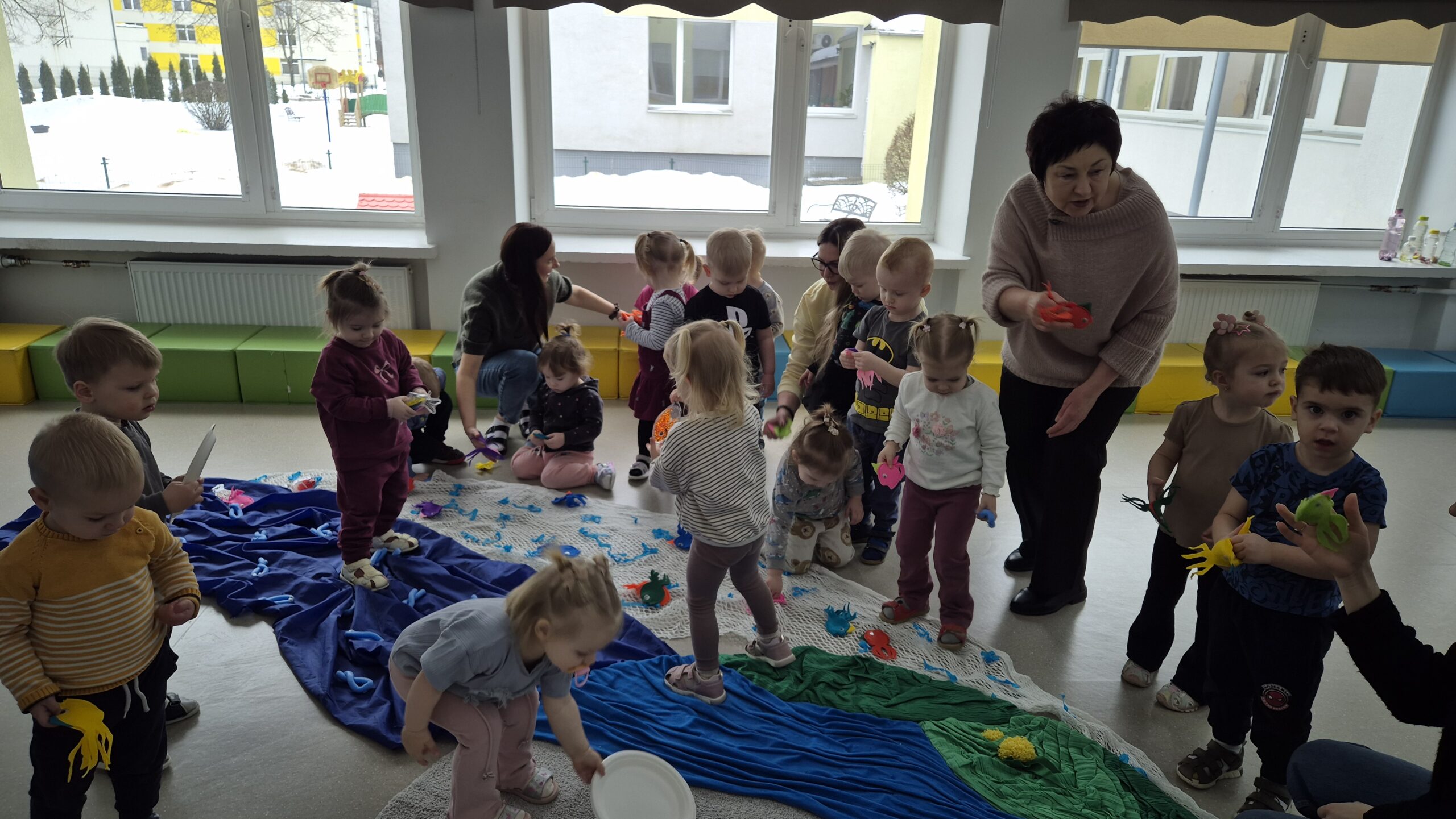 Šiandien salėje, mokytojos Deimantė, Jolita ir Ieva sukūrė ankstyvojo ugdymo vaikučiams pojūčių takelį. Mažieji žaidė kūrybinius žaidimus, gaudė vėją, žuvytes, kūrė skruzdėlyną, muzikavo savo gamybos instrumentais.