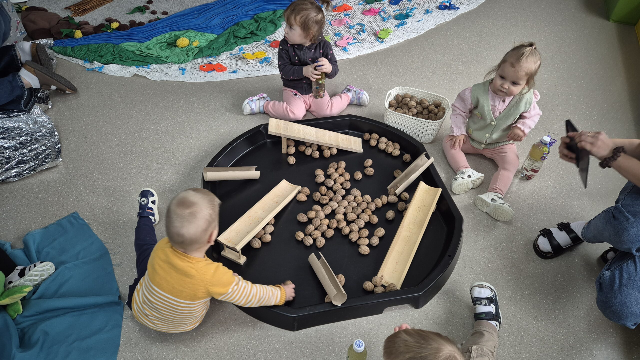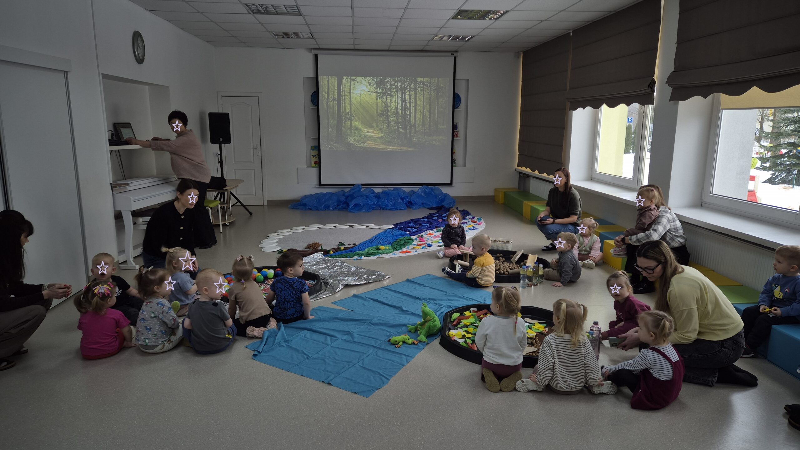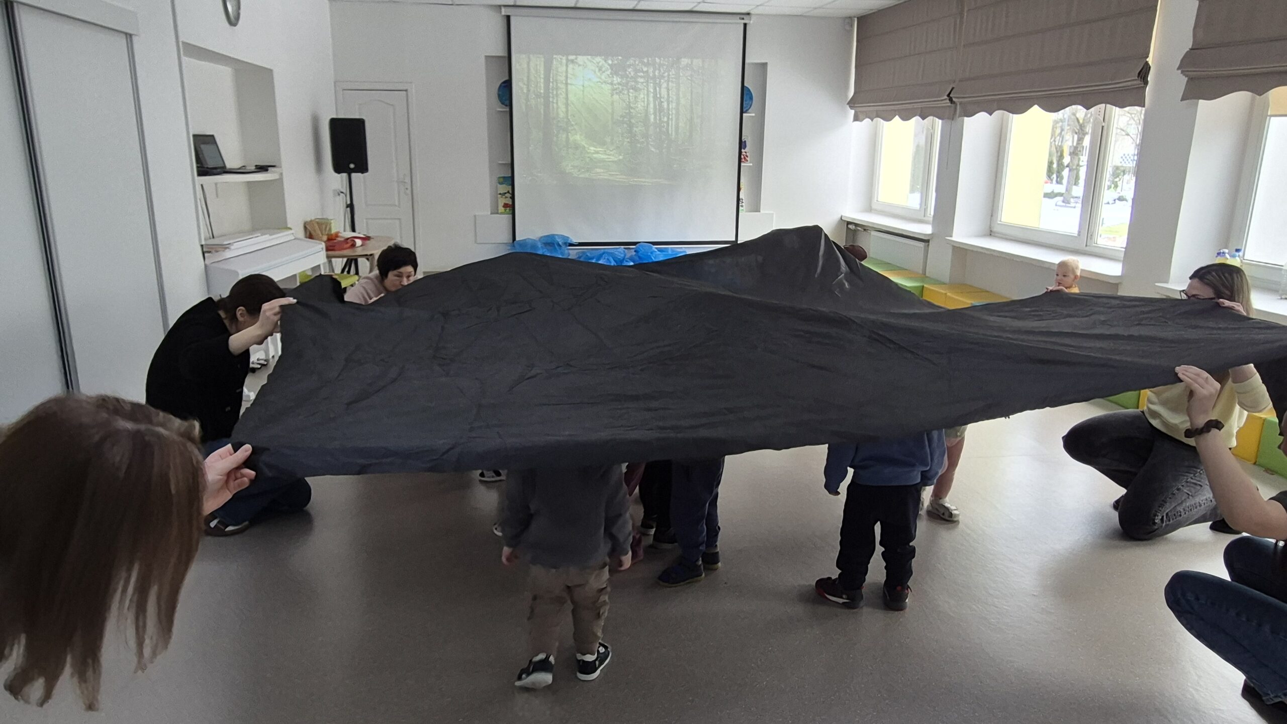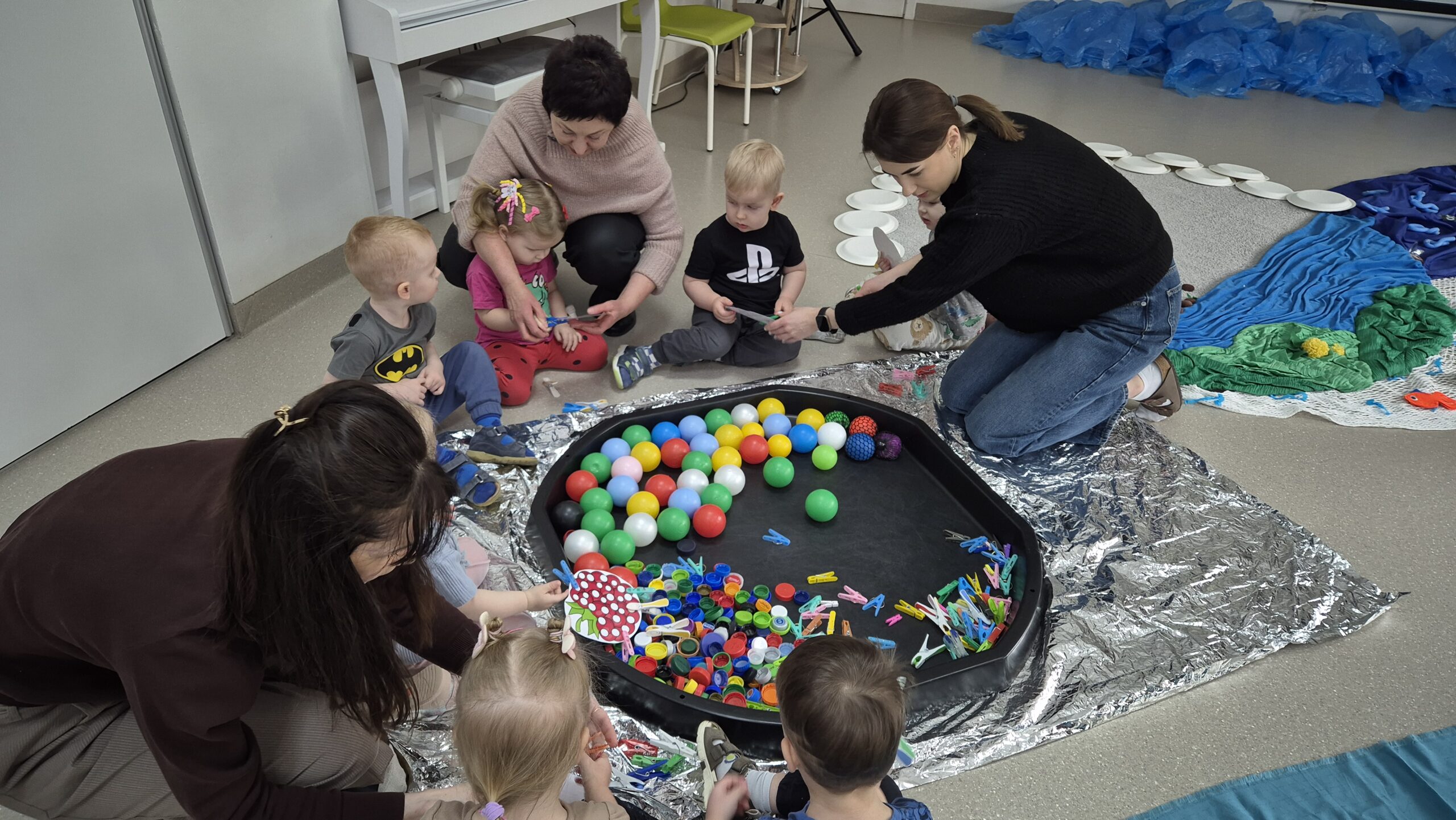 Šiandien salėje, mokytojos Deimantė, Jolita ir Ieva sukūrė ankstyvojo ugdymo vaikučiams pojūčių takelį. Mažieji žaidė kūrybinius žaidimus, gaudė vėją, žuvytes, kūrė skruzdėlyną, muzikavo savo gamybos instrumentais.