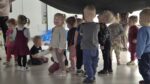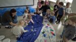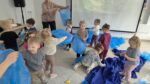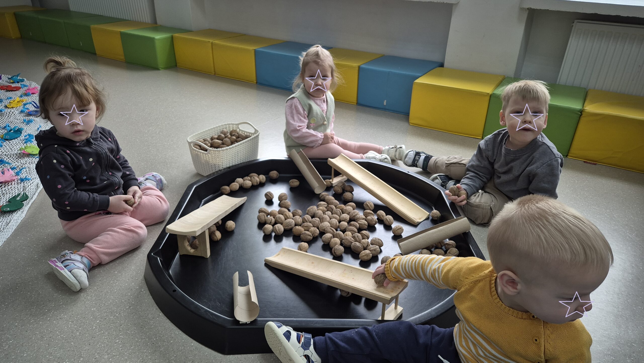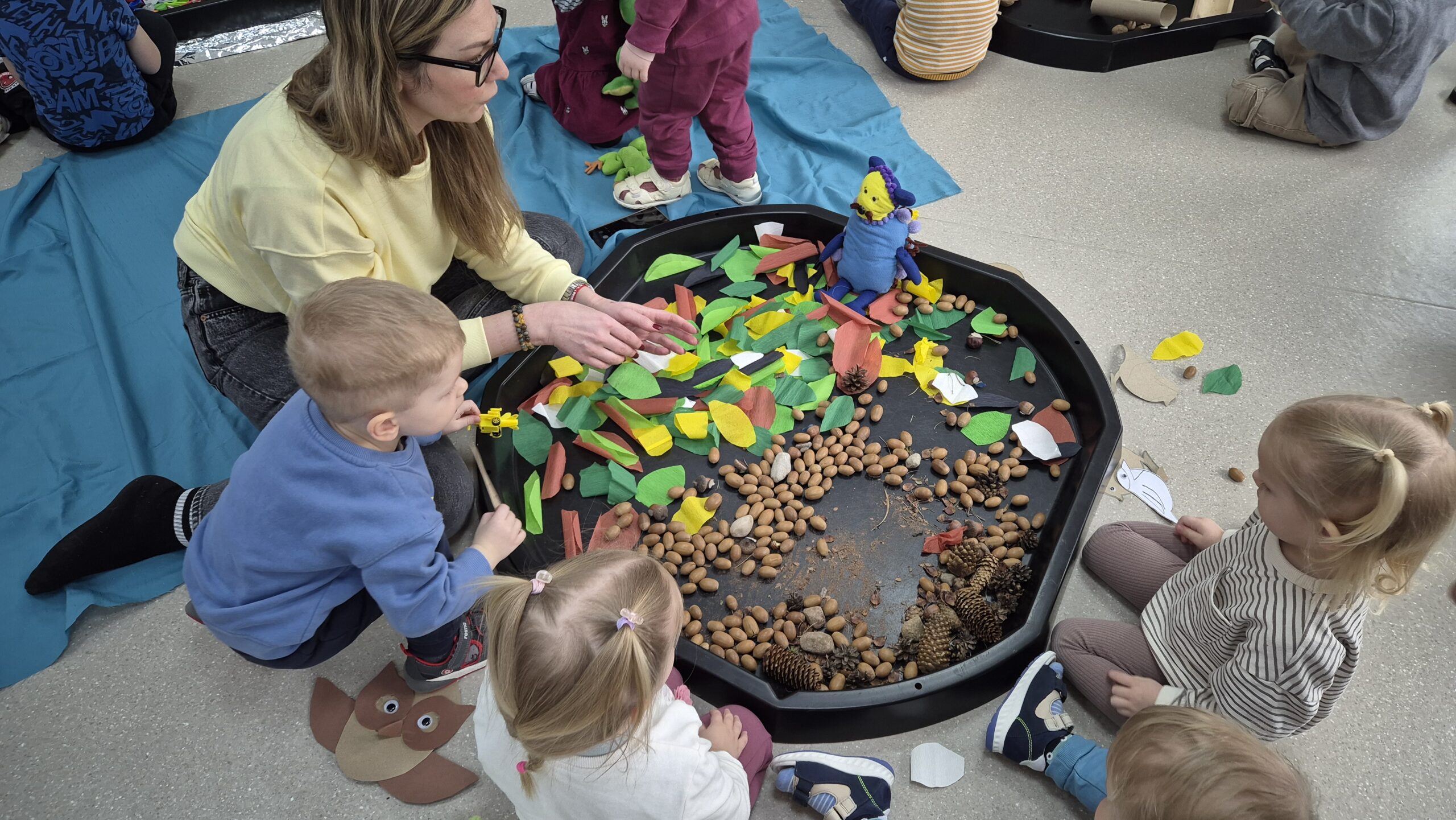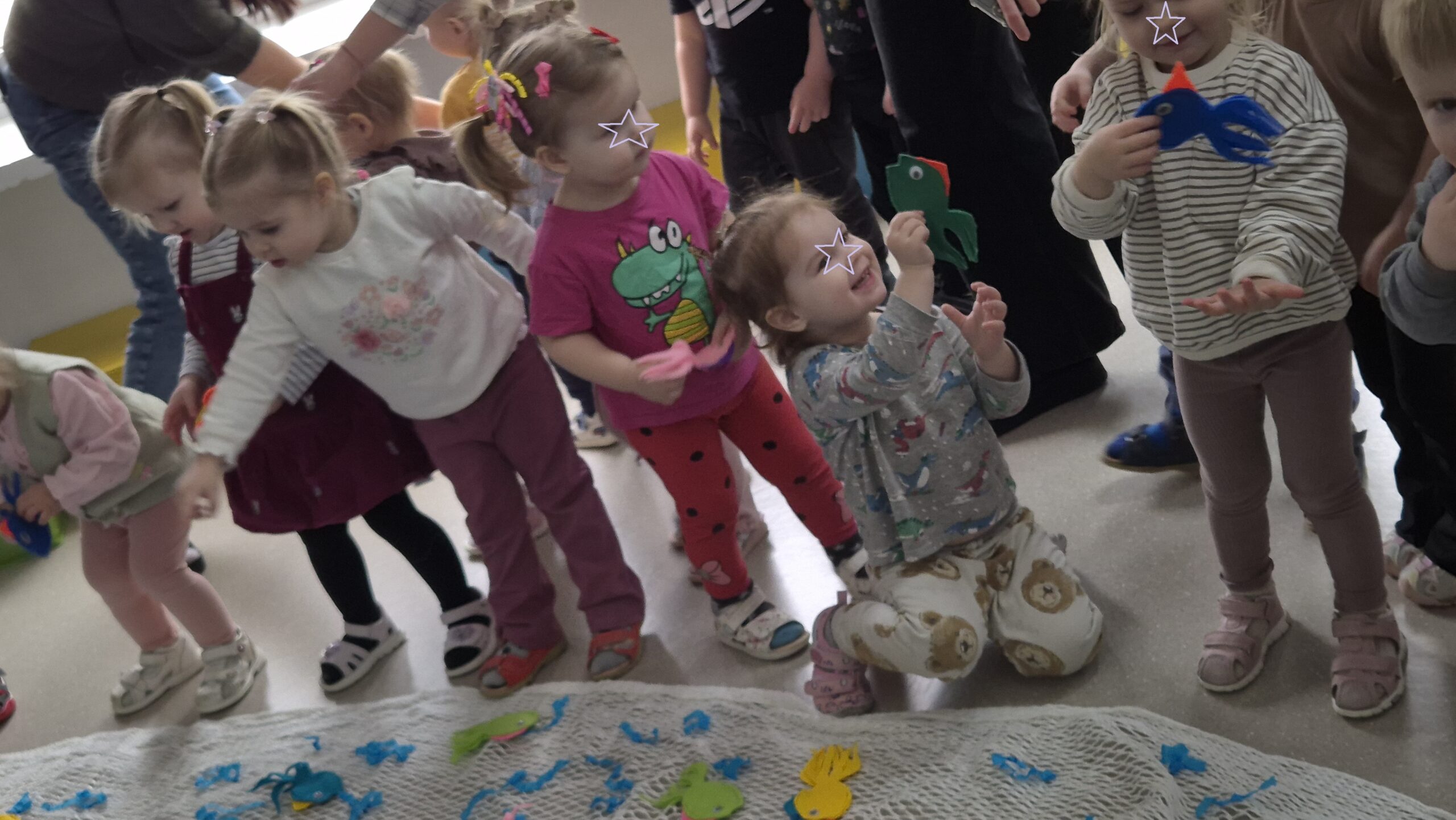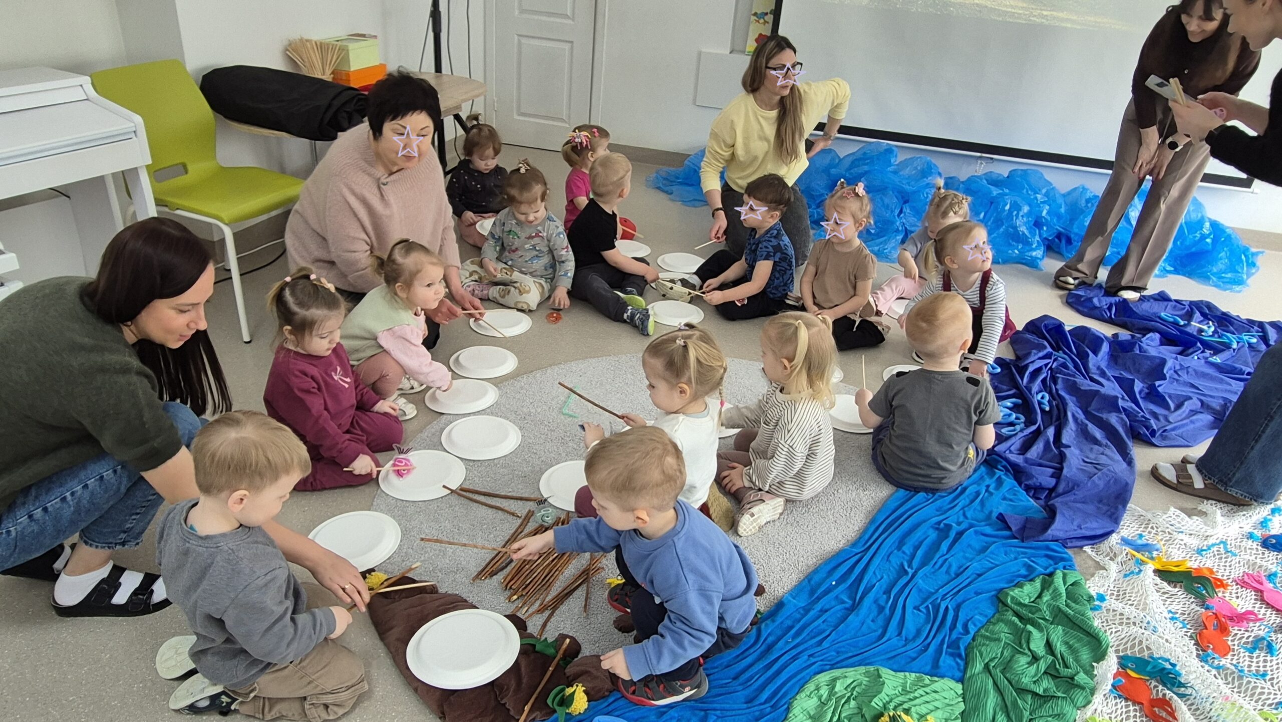 Šiandien salėje, mokytojos Deimantė, Jolita ir Ieva sukūrė ankstyvojo ugdymo vaikučiams pojūčių takelį. Mažieji žaidė kūrybinius žaidimus, gaudė vėją, žuvytes, kūrė skruzdėlyną, muzikavo savo gamybos instrumentais.