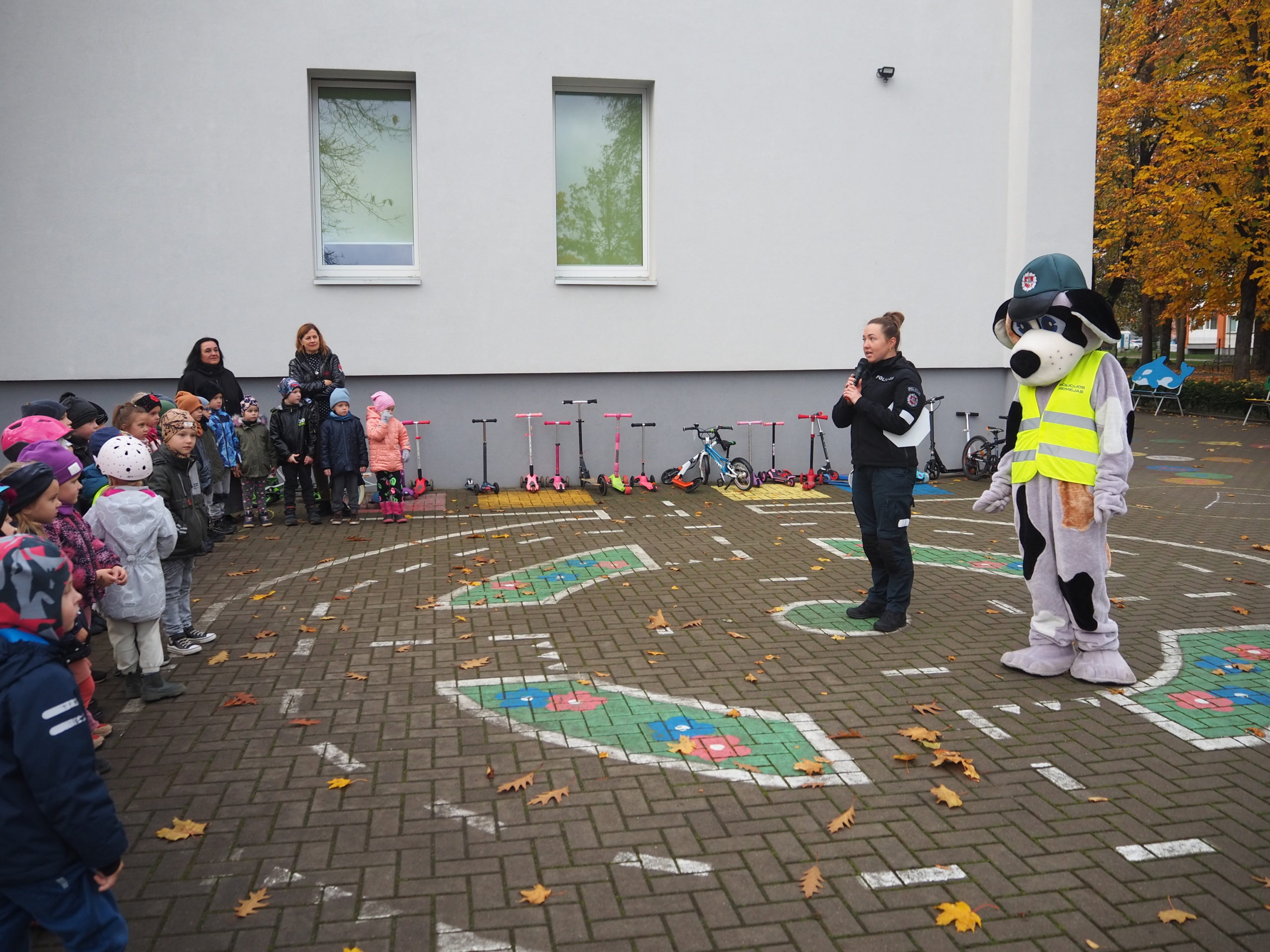 Spalio 18 d. „Aitvarų“, „Bitučių“ ir „Širdukų“ grupėms vyko edukacinė pamokėlė „Aš saugus kelyje“. Policijos atstovė Judita kalbėjo vaikučiams apie saugos priemones važinėjant dviračiu, paspirtuku, mokė teisingai ir saugiai pereiti gatvę. Pamokėlėje vaikučiai pabuvojo tikrais eismo dalyviais – ir vairuotojais, ir pėsčiaisiais. Įgiję žinių, pažaidę judrius žaidimus, vaikučiai linksmai pozavo nuotraukoje su Amsiumi.