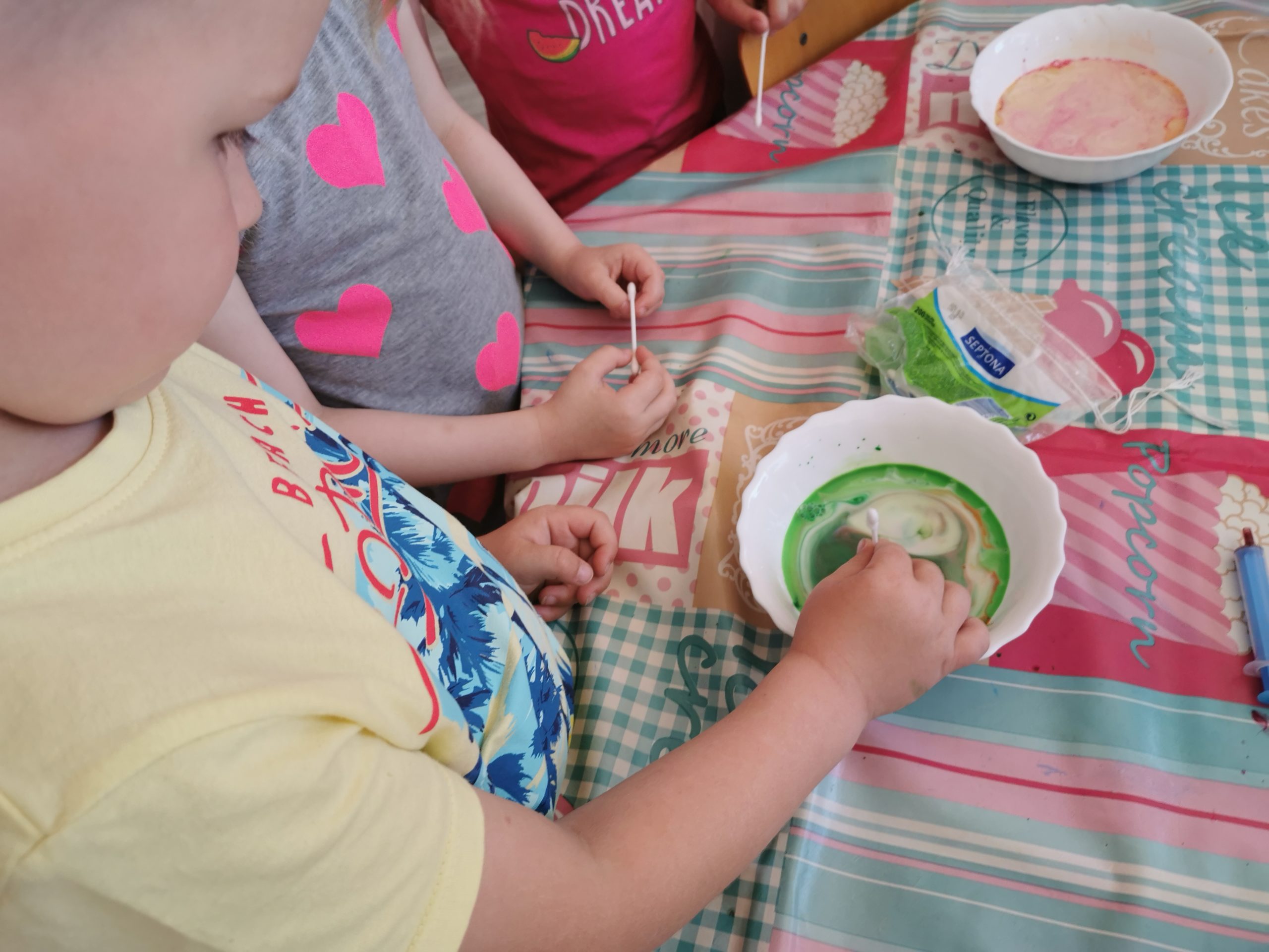 „Kodėlčiukai“ visą rytą žaidė spalvomis: piešė gėlių kilimėlius, darė „spalvų makaliūzes“, piešė ant pieno, kūrė koliažus iš gamtinės medžiagos…
