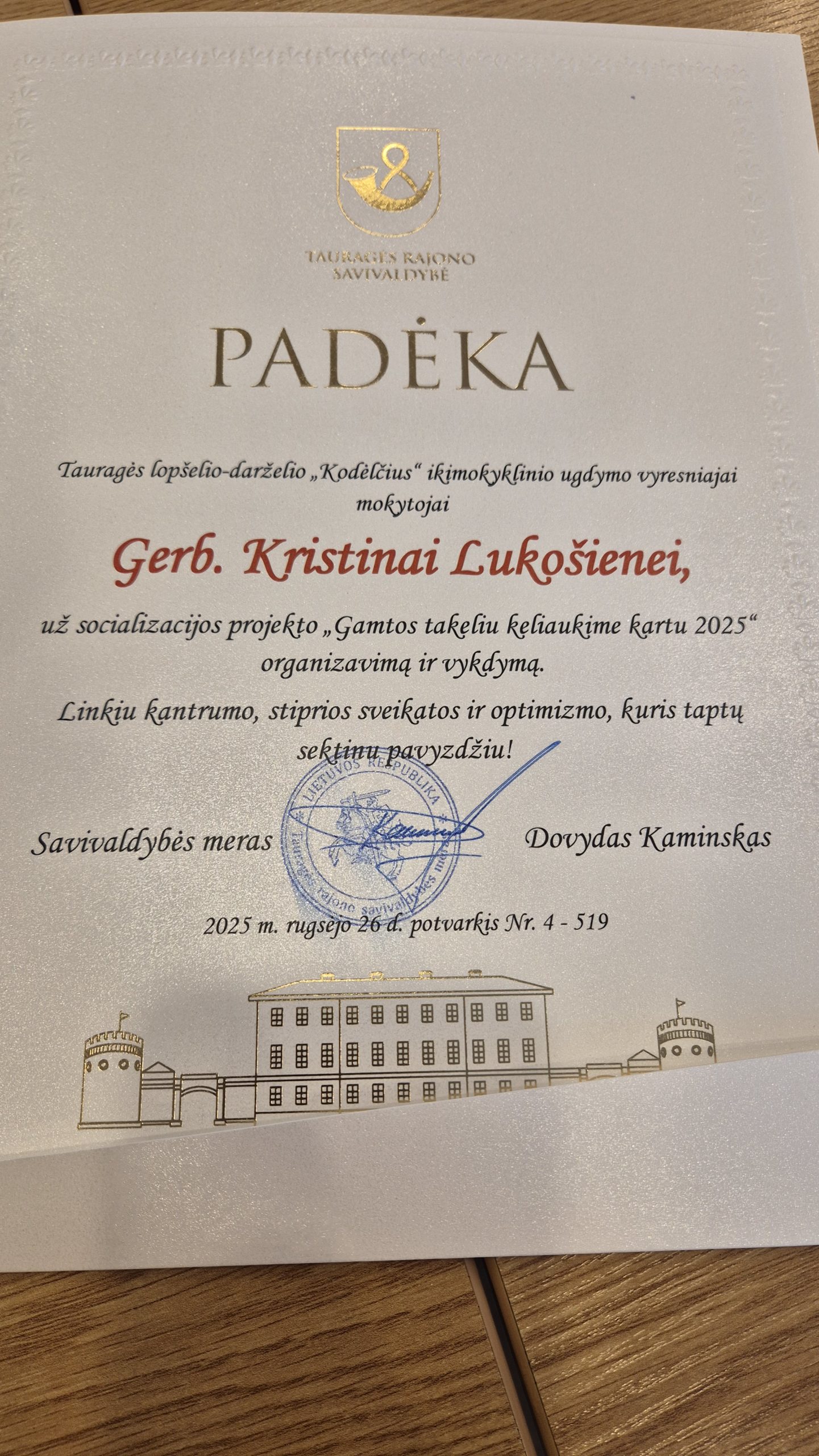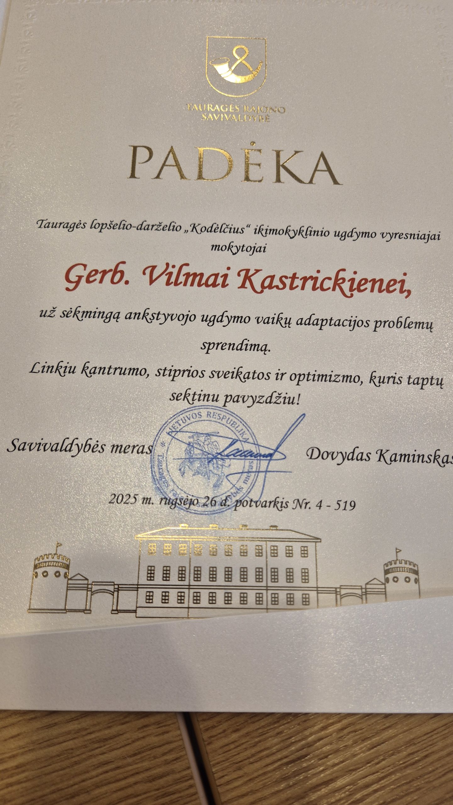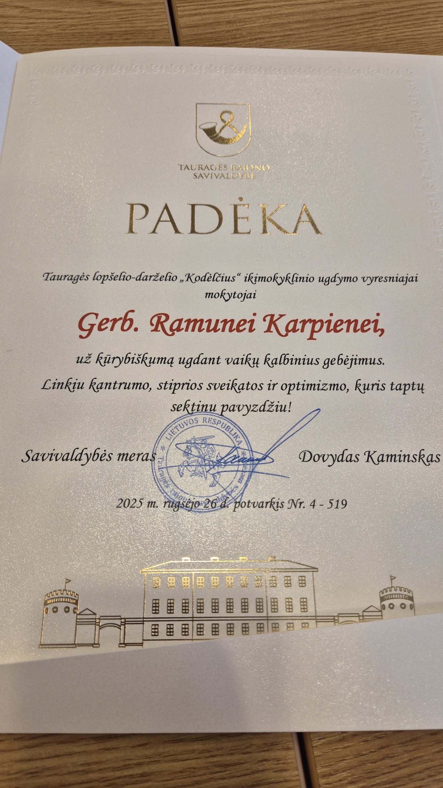 Spalio 6 d. Tauragės rajono savivaldybėje vyko šventinė popietė, skirta Tarptautinei mokytojų dienai. Šventės metu už nuolatinį siekį kurti saugią, kūrybišką ir įkvepiančią aplinką Tauragės mero padėka buvo apdovanota lopšelio-darželio direktorė Lina Kymantienė. Padėkomis už puikius darbo rezultatus taip pat pagerbtos mokytojos Kristina Lukošienė, Ramunė Karpienė ir Vilma Kastrickienė. Džiaugiamės ir didžiuojamės mūsų bendruomenės pedagogėmis! Jūsų kasdienis darbas, kantrybė ir šiluma kuria stebuklus vaikų širdyse.