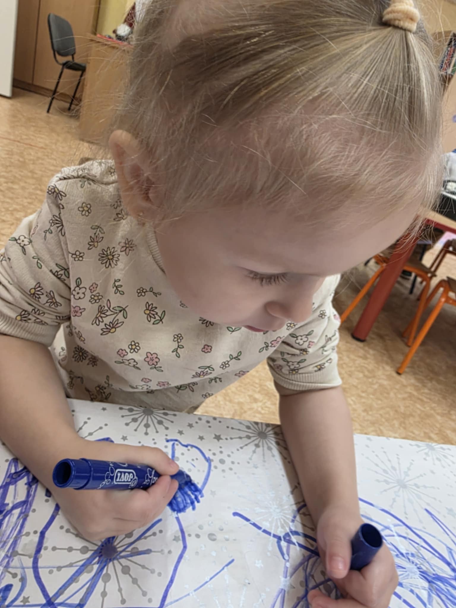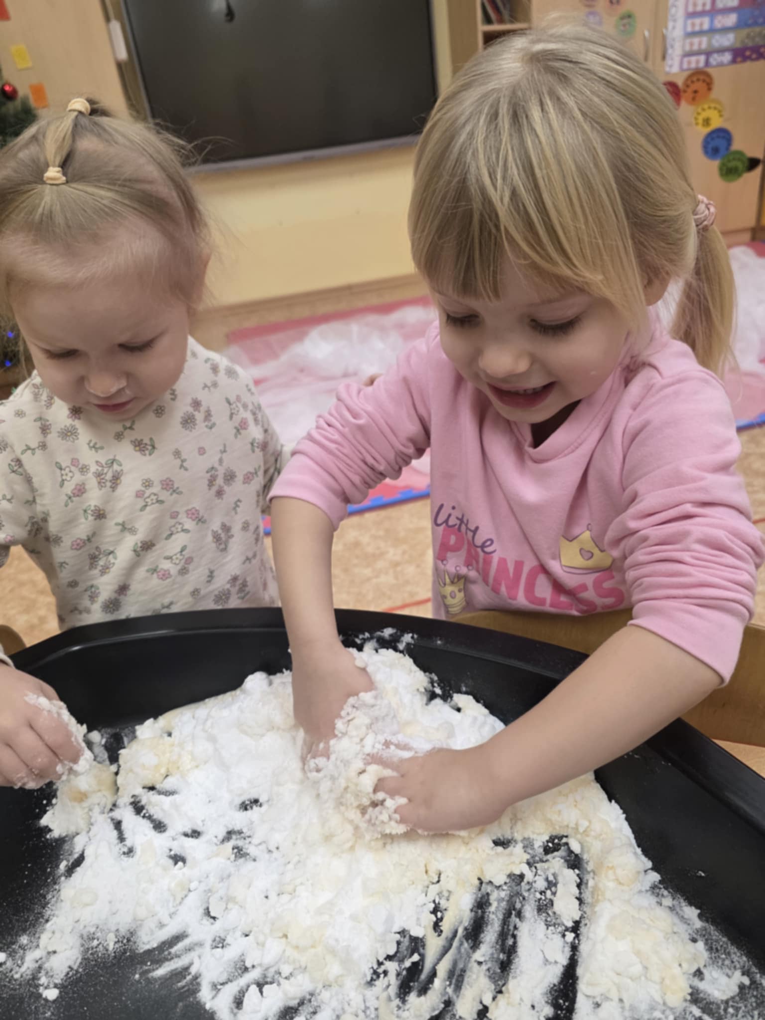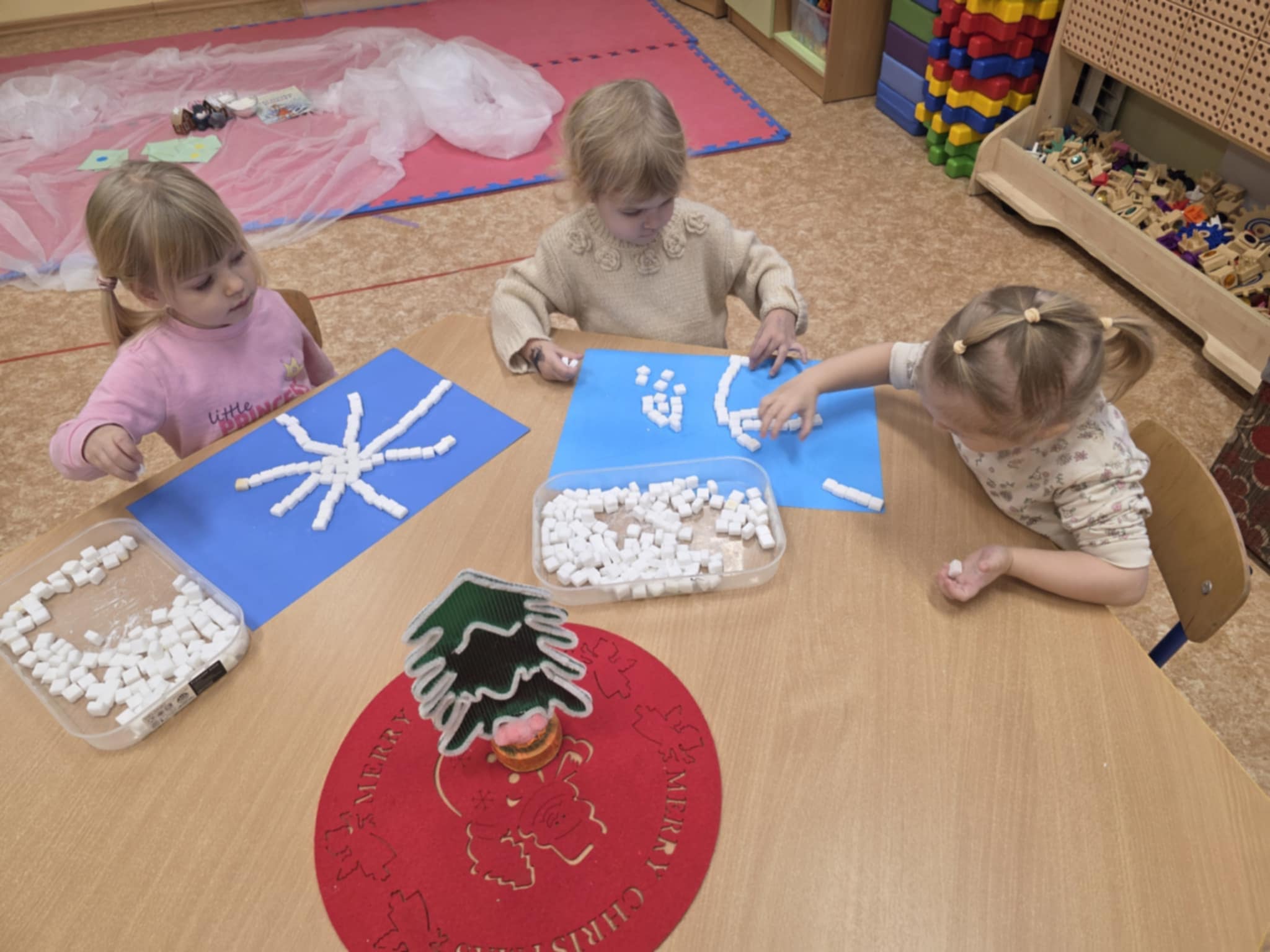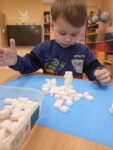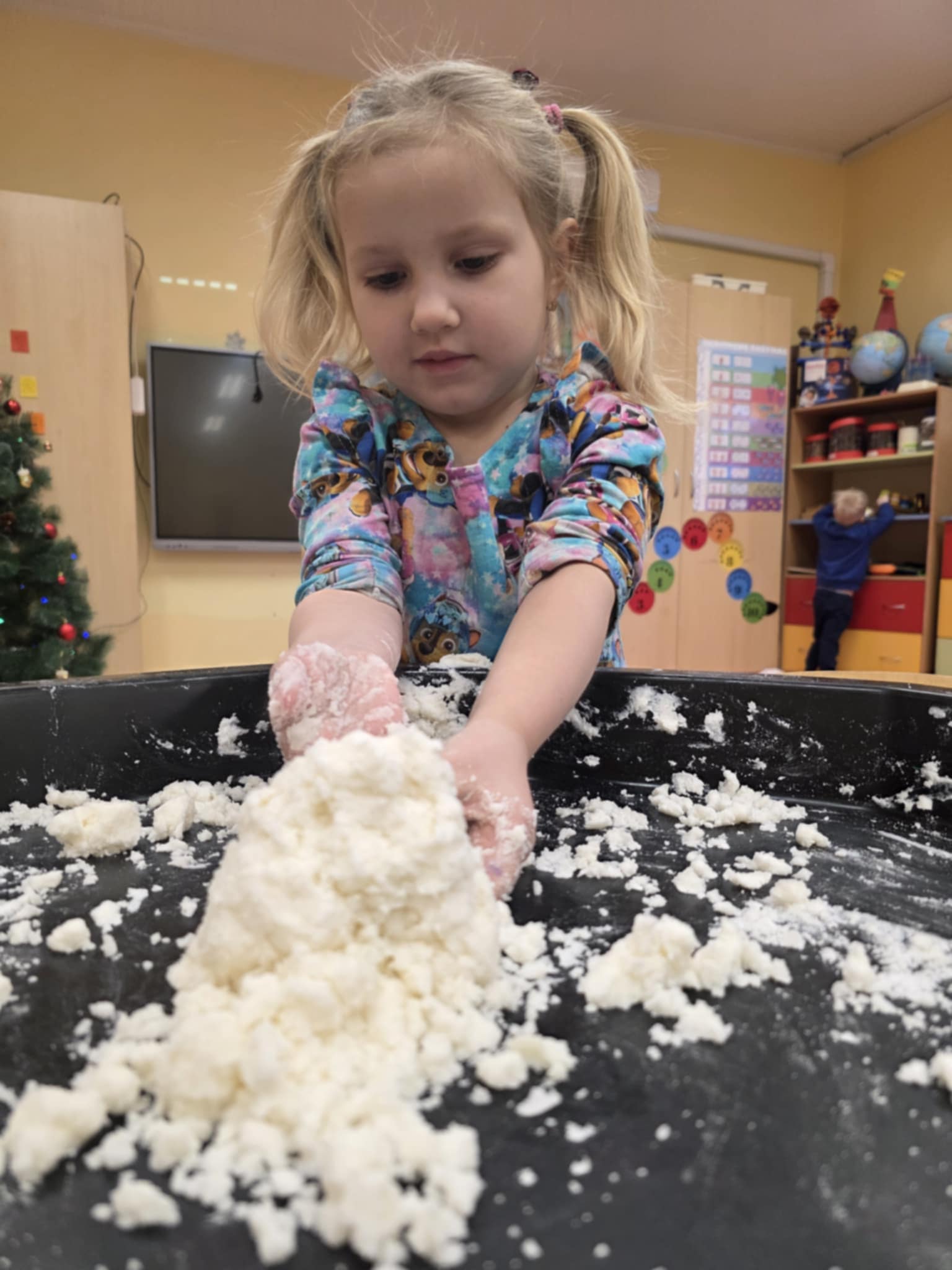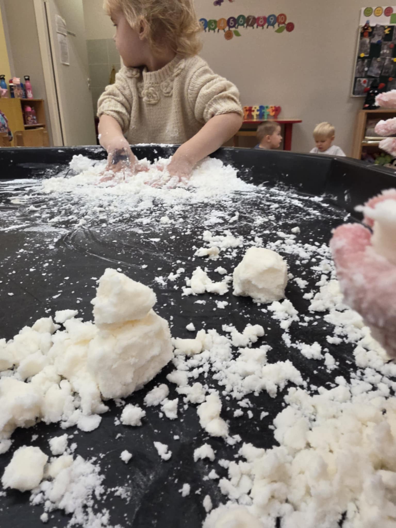 „Boružėlių“ grupės vaikučiai, klausydami „Kodėlčiukų“ pasakos, aiškinosi į ką yra panašus sniegas? Vėliau kūrybinėse erdvėse konstravo, piešė snaiges, lipdė iš dirbtinio sniego.